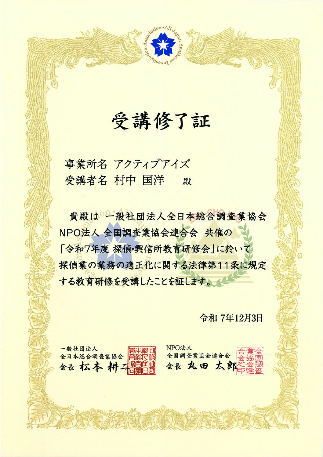 一般社団法人全日本総合調査業協会 NPO法人全国調査業協会連合会 共催の「令和7年度探偵・興信所教育研修会」に参加しました。